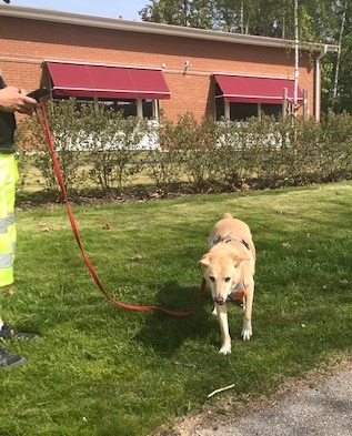 Är ute på morgonrundan. Matte visste först inte om hon vågade ta elrullstolen för något är det som inte stämmer med den men hon chansade. Ett skrapande ljud hörs och när matte stannade i uppförsbacke igår då Albin skulle kissa så tog inte bromsen så hon gled bakåt. Inte bra alls!