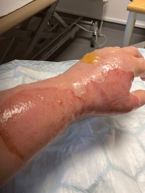 Lena var på återbesök hos läkaren på Västerås sjh igår. Han tyckte att brännskadan ser ut att läka fint men hon ska tillbaks dit i morgon redan. Bilder därifrån.
