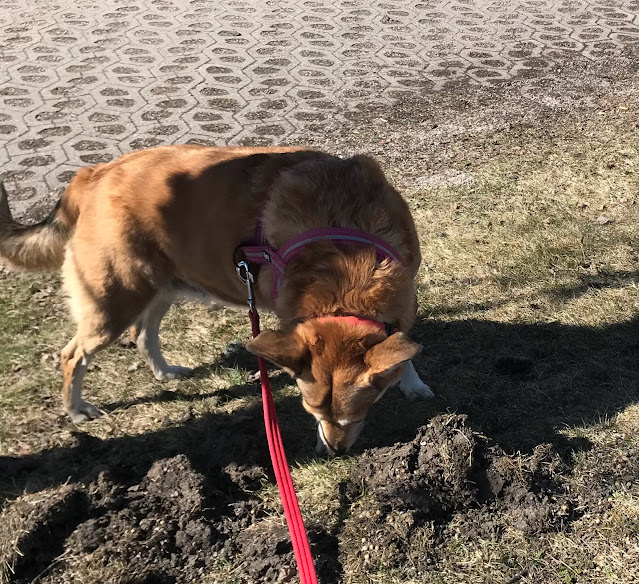Albin fick ett mindre utbrott på den stora vackra schäfern. Matte såg den inte, för ägaren hade gått åt sidan och ställt sig bakom ett buskage men som sagt, Albin missar ingenting. Nu lyckades matte lugna ner honom ganska så snabbt ändå....