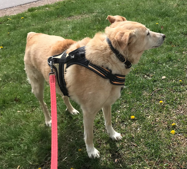 Inte hade han bråttom ut på långpromenaden heller. Här hör han att det skjuts någonstans, troligen från skjutbanan, även om matte tyckte att det kom från annat håll...