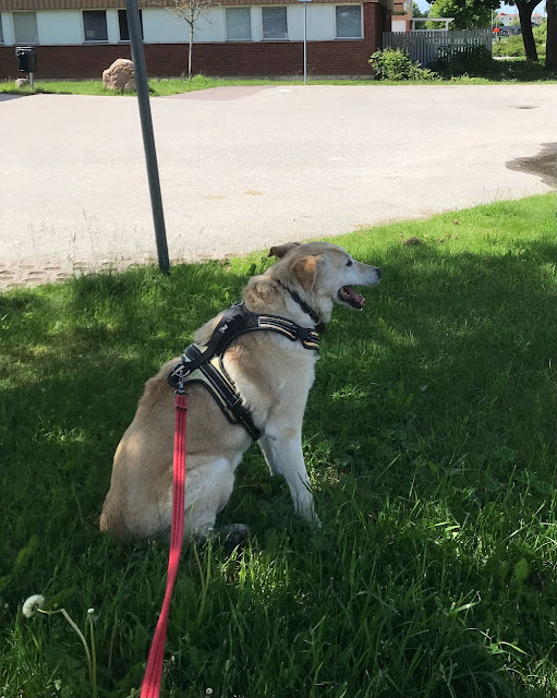 Så skönt, nu är det inte så jättelångt kvar innan vi är hemma, om nu inte matte viker av där framme och tar en omväg. Tack o lov, gjorde hon inte det....