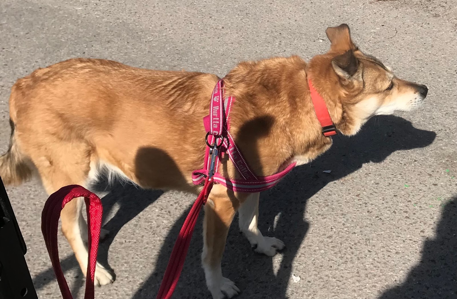 ...ända tills han fick syn på den stora vackra schäfern. Då ville han dra iväg men det fick han inte för matte. Han fick gå i sakta mak uppför gångvägen